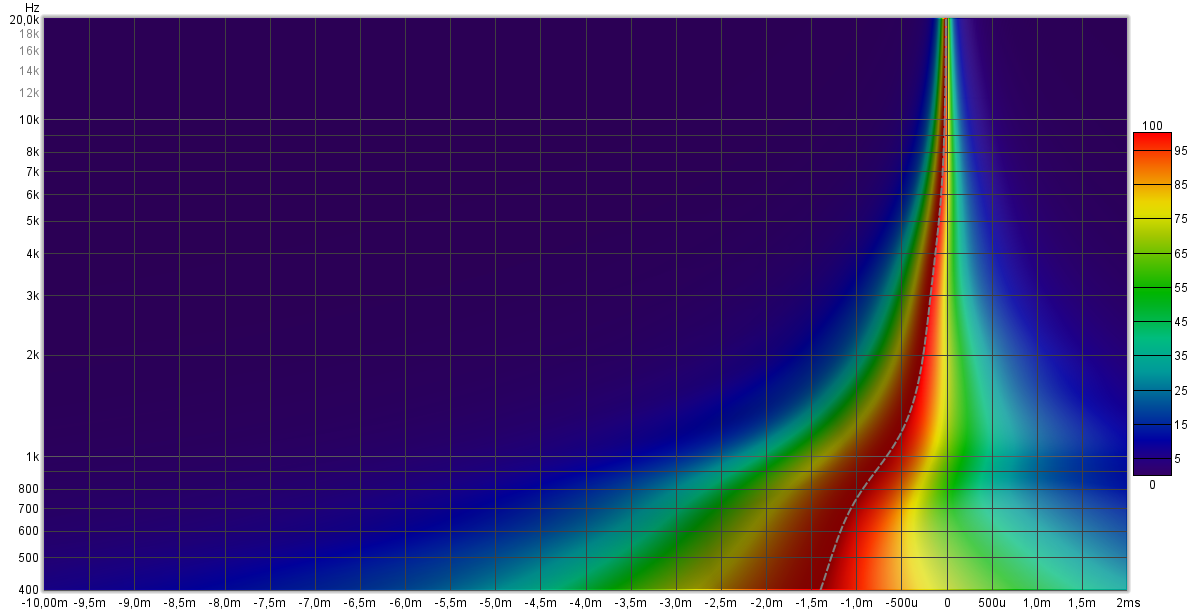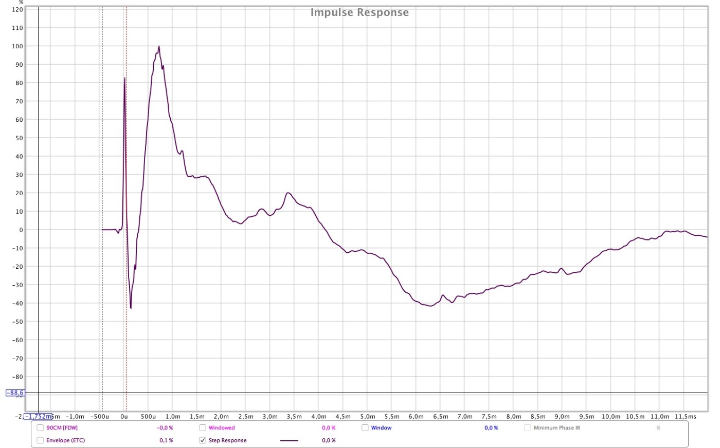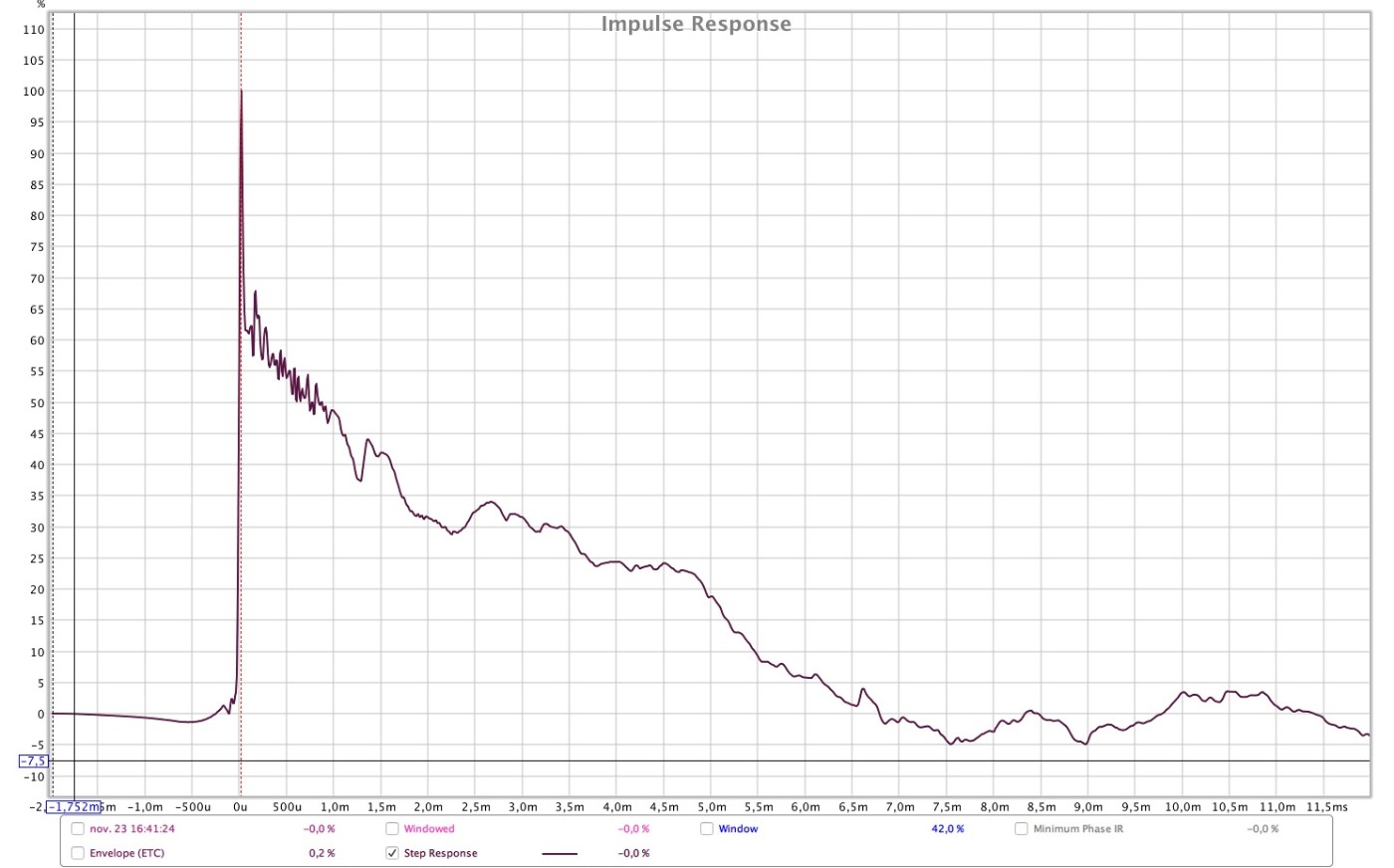 Sur les mesures montrées on voie que la correction de phase pose un problème majeur, le signal arrive trop tôt, on le voie sur le spectro et sur la réponse impulsionnelle, comme quoi il ne faut pas uniquement se fier a la lecture du "peak energy time" qu'il ne faut donc pas obligatoirement caler a zero, ce genre de défaut peu être très audible a l'écoute, plus qu'un peu de délai de groupe.