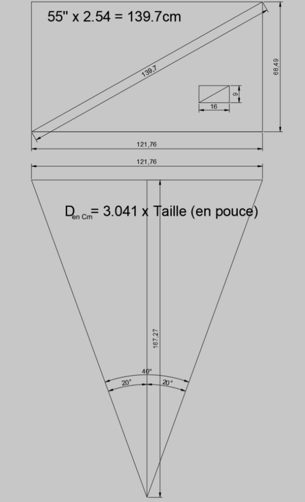 Sur un 55" pour avoir un angle de 40° il faut avoir un recul de 1m67 ... Vous allez me dire que c'est très proche, et bien c'est ce qui est préconisé pour le cinéma, cela signifie que si vous recherchez de l'immersion avec votre téléviseur comme au cinéma, n'ayez pas peur de prendre grand si vous avez la place, le budget et l'envie
