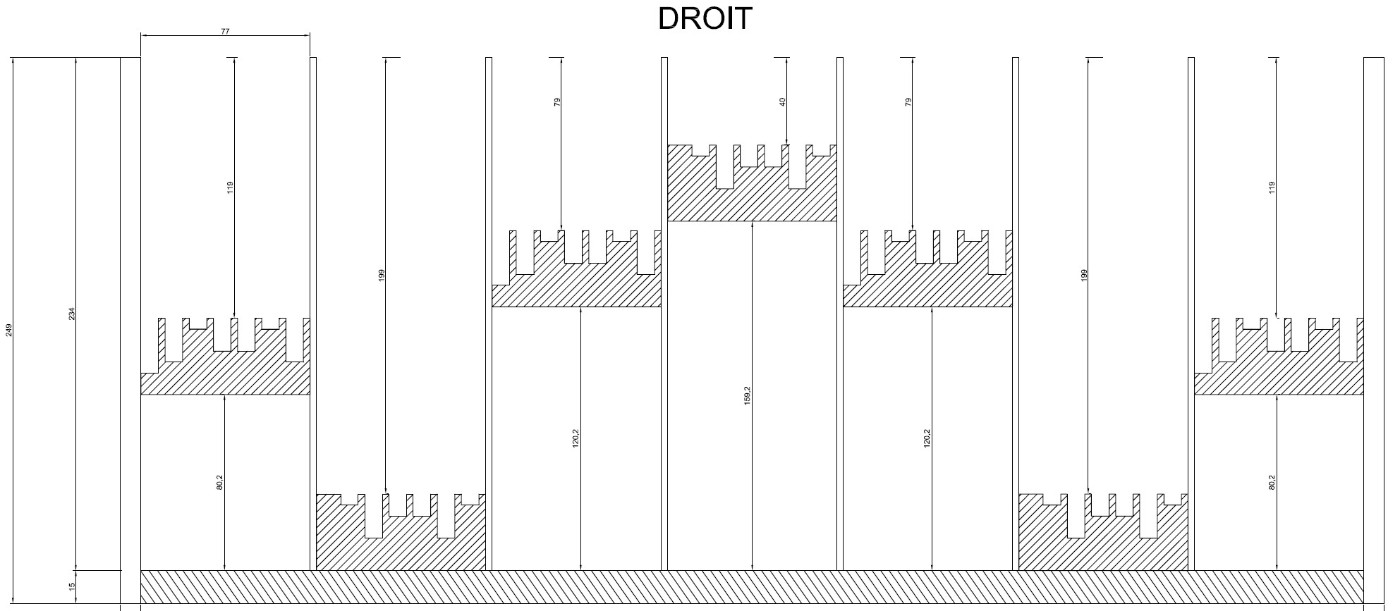 les résonateurs fractal alternent un « droit » et son inverse. Ce choix avec le recul est je pense exagéré car selon le site https://www.subwoofer-builder.com/qrdude.htm « Faire pivoter un panneau standard de 180 degrés est la solution la plus simple lorsque l’un multiplie les diffuseurs ». Mais je tenais à construire un alterné droit/inverse, pour en mesurer les effets (et la faisabilité de réalisation d’autre part).