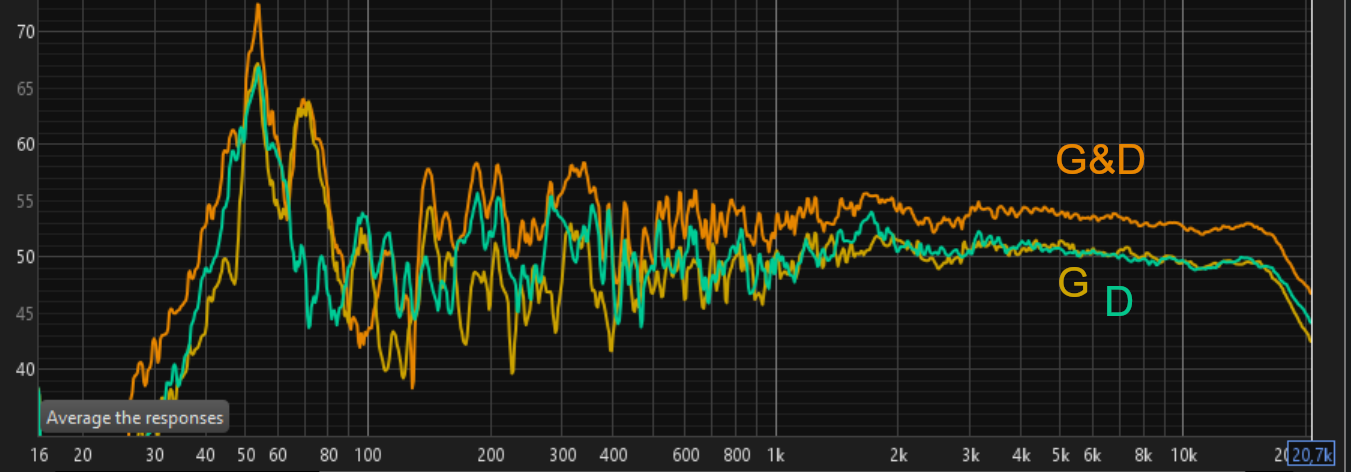 La différence gauche / droite est moindre qu'avec la correction commune. Sur cette dernière, de 150 à 400 Hz, il n'y a vraiment que l'enceinte droite qui travaille. L'acoustique de ma pièce fait que ces fréquences sont renforcées là où se trouve cette enceinte.