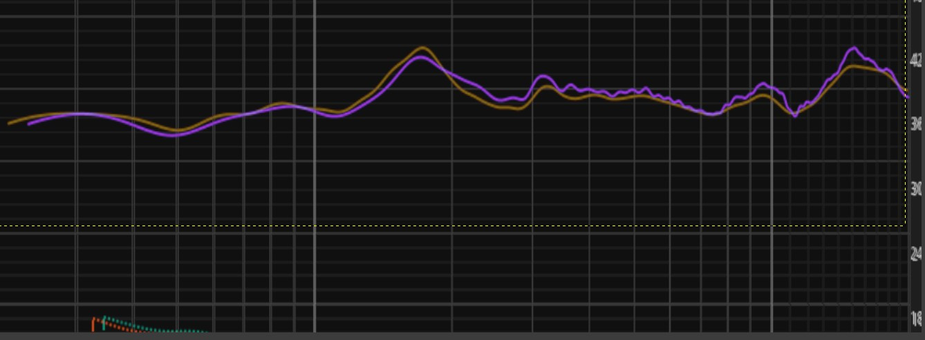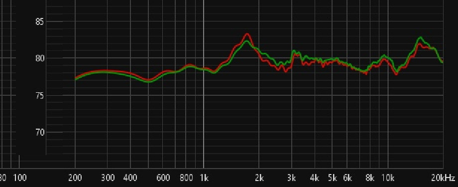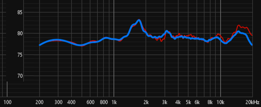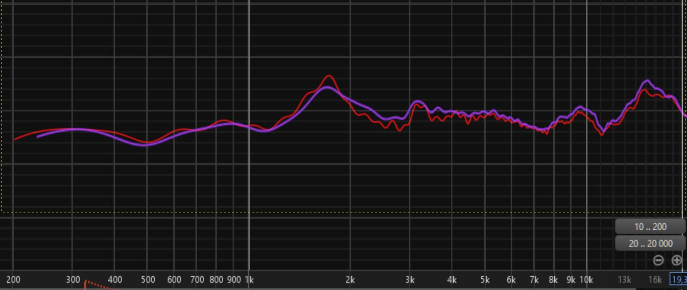 La courbe rouge est la courbe dans l'axe. Il est important d'examiner attentivement ces courbes. Par exemple à 9500 Hz, la mesure dans l'axe est la seule à présenter un pic. Il est donc totalement inutile de le corriger, d'autant plus que mes oreilles ne sont pas dans l'axe.
