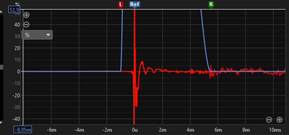 Dans REW, après avoir fait la mesure, j'affiche l'impulsion, avec échelle verticale en %, et je zoome sur les premières millisecondes.